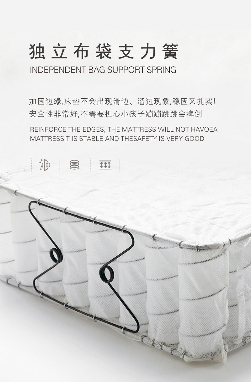 填充物: 硬质棉上 ,独立布袋支力簧 ,硬质棉下 ,透气3D网布Hard cotton top Independent cloth bag support spring Solid cotton felt Breathable 3D mesh fabric
