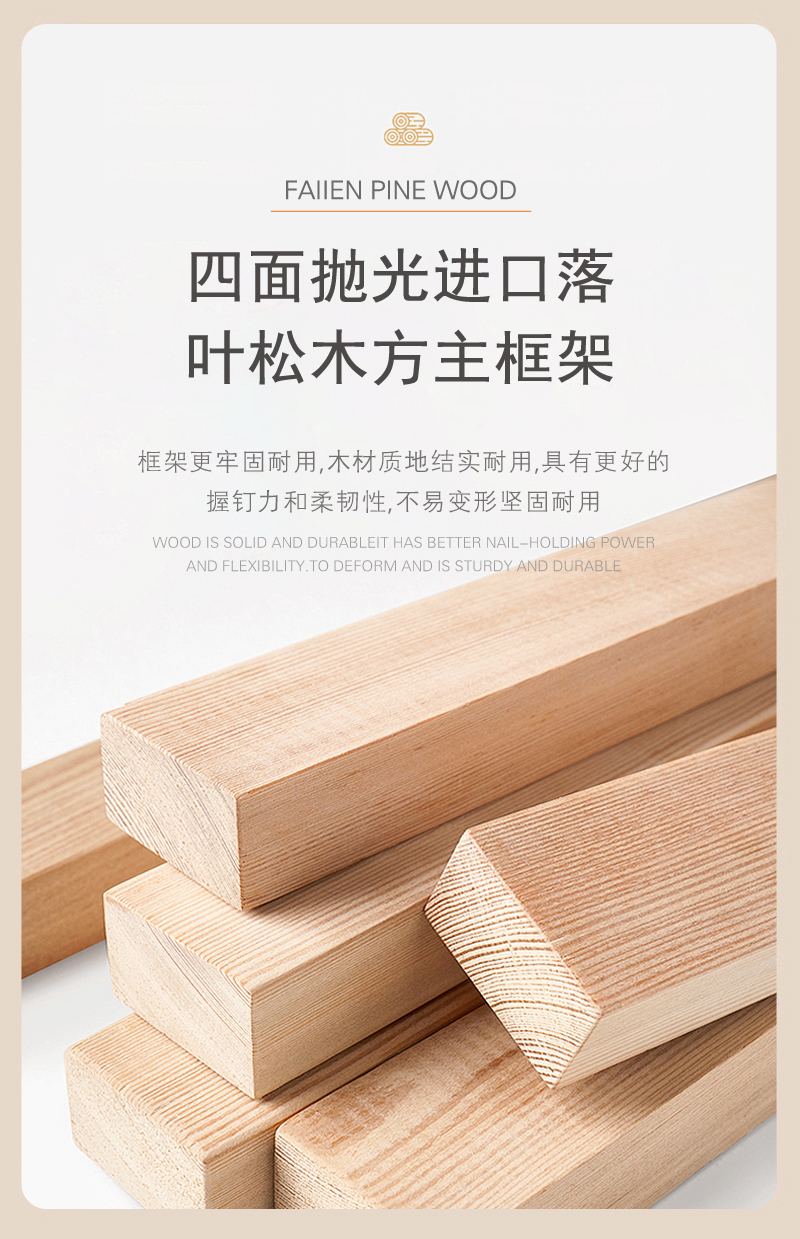 框架: 实木框架 ,俄罗斯进口落叶松实木框架 ,四面抛光进口落叶松木方主框架 ,五金脚 ,俄罗斯落叶松Solid Wood Frame ,Russian larch solid wood frame ,Four sides polished imported larch square main frame ,Metal feet ,Russian larch