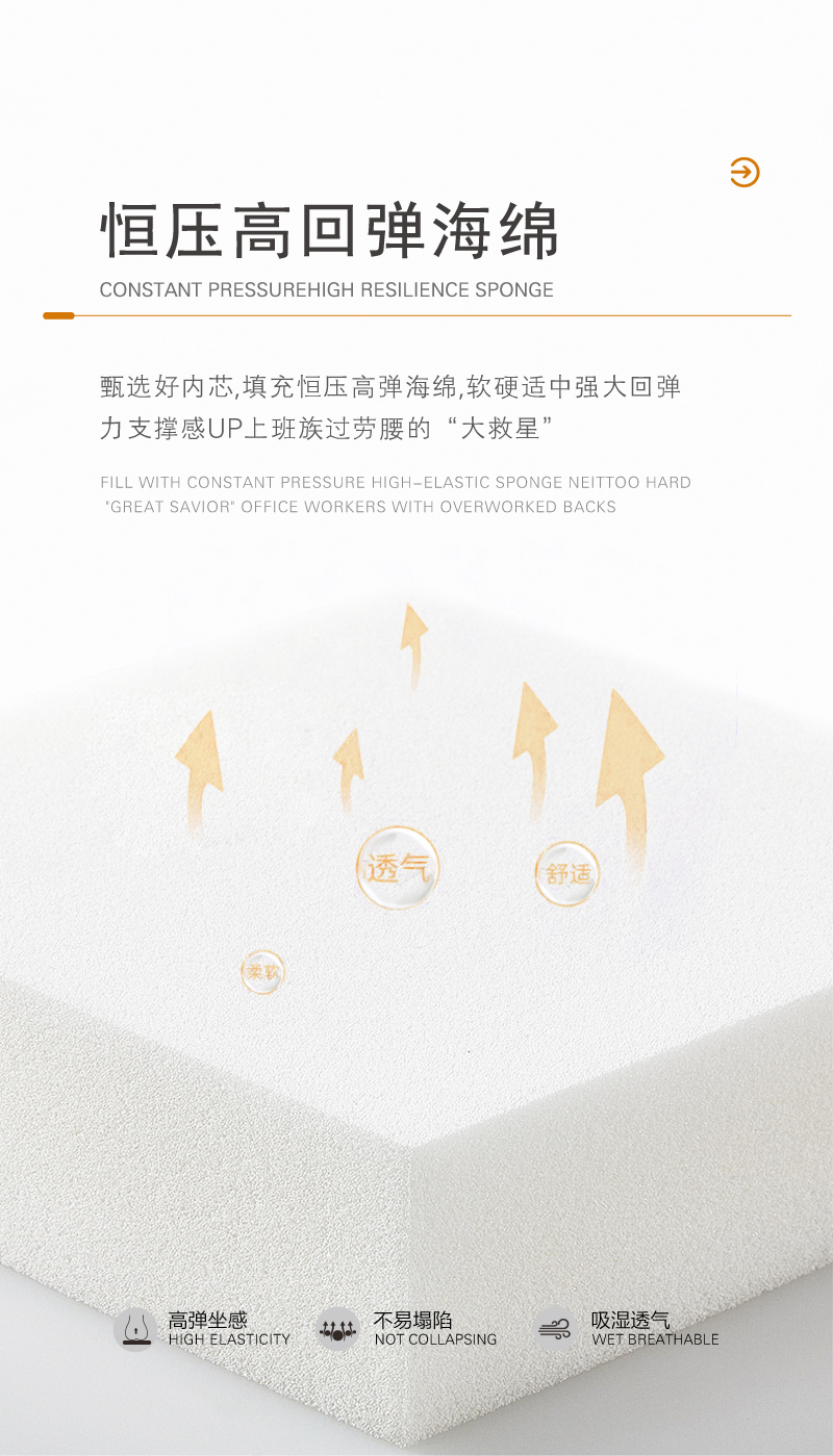 优选高弹高回弹海绵、高密度,高承重