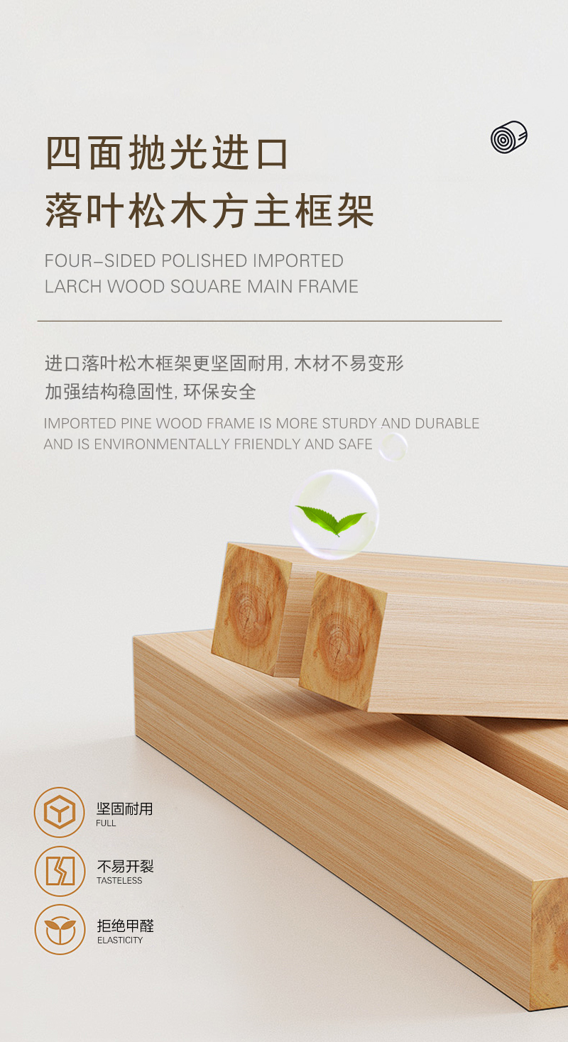 框架: 实木框架 ,俄罗斯进口落叶松实木框架 ,四面抛光进口落叶松木方主框架 ,五金脚 ,加厚加宽绷带 ,俄罗斯落叶松Solid Wood Frame ,Russian larch solid wood frame ,Four sides polished imported larch square main frame ,Metal feet ,Thickening and widening bandages ,Russian larch
