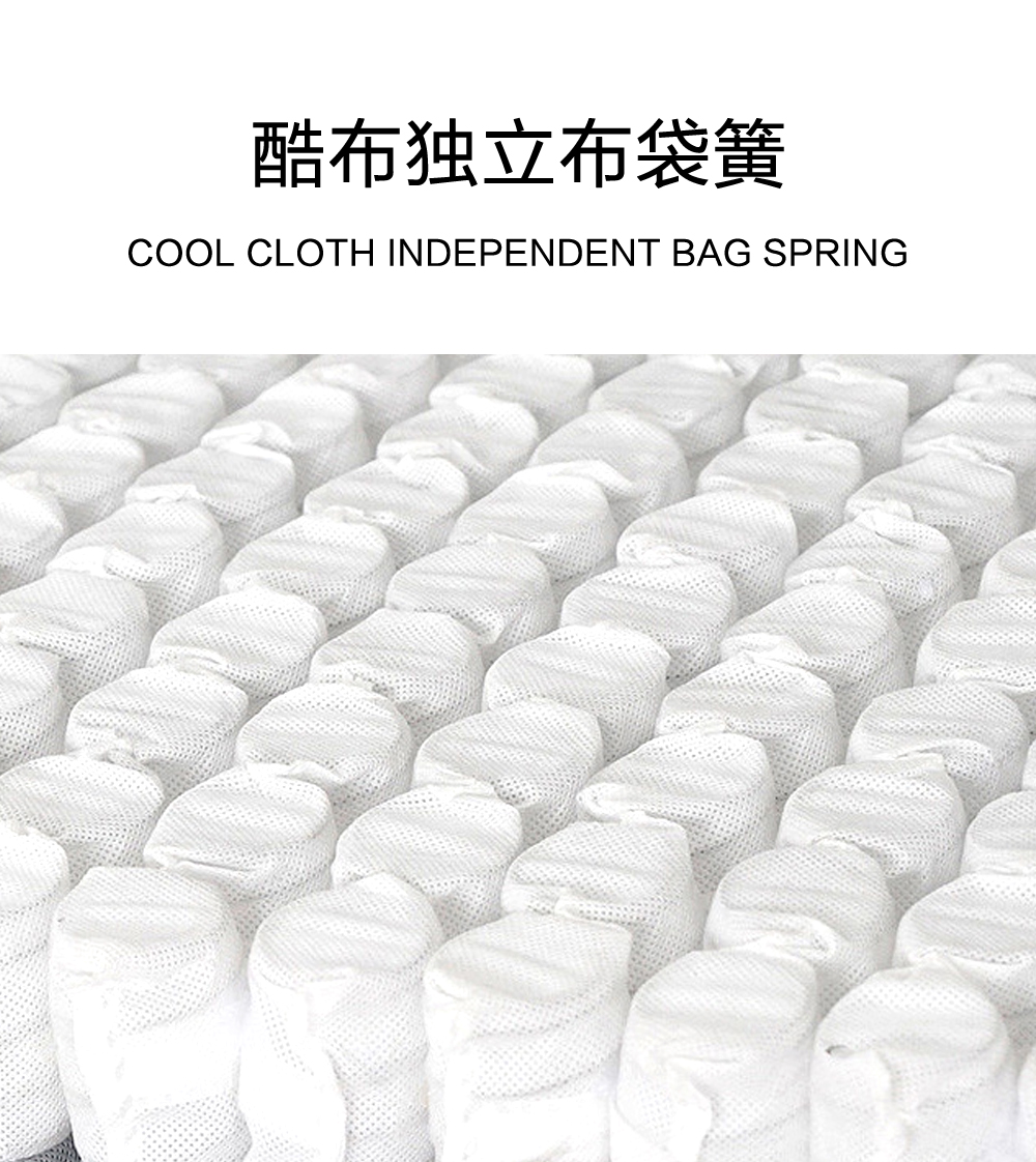 填充物: 水洗乳胶 ,零压记忆棉 ,5公分海绵侧加固 ,热合毡 ,酷布独立布袋簧Latex zero touch memory foam 5 cm sponge side reinforcement Eco-friendly hot melt felt Pocket springs with top and bottom sponbond fabrics