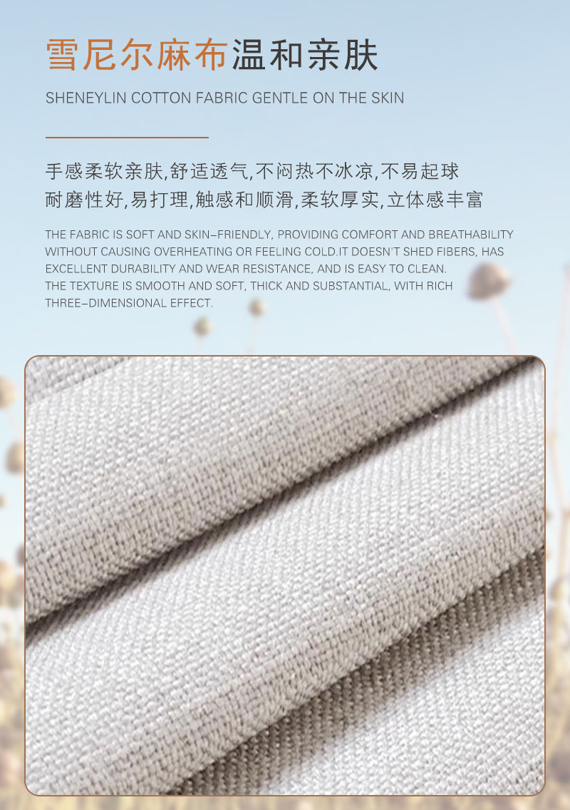 面料: 亲肤针织面料 ,雪尼尔麻布Three prevention functional fabric ,Chenille linen